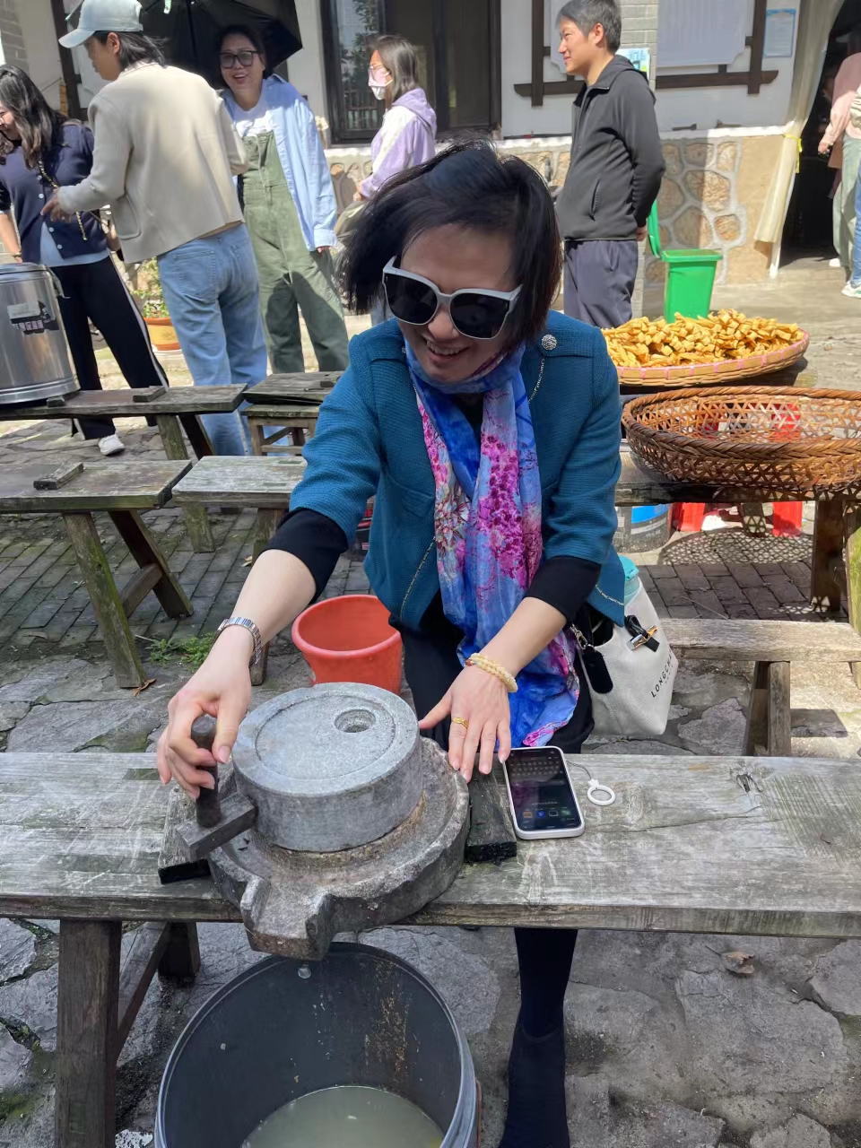 首站,我们来到了风景如画的江宁汤山,这里是江宁区首批“五朵金花”之一的“汤山七坊”。在当地讲解员的热情引导下,我们参观了充满历史气息的孟墓乡贤馆和党群微家,深入了解了新时代乡村建设的成果和乡村振兴战略的实施情况。在七坊,我们不仅领略了美丽乡村的风貌,还亲身体验了传统手工艺的魅力,如手工磨制豆浆,感受到了匠人精神的传承和发扬。