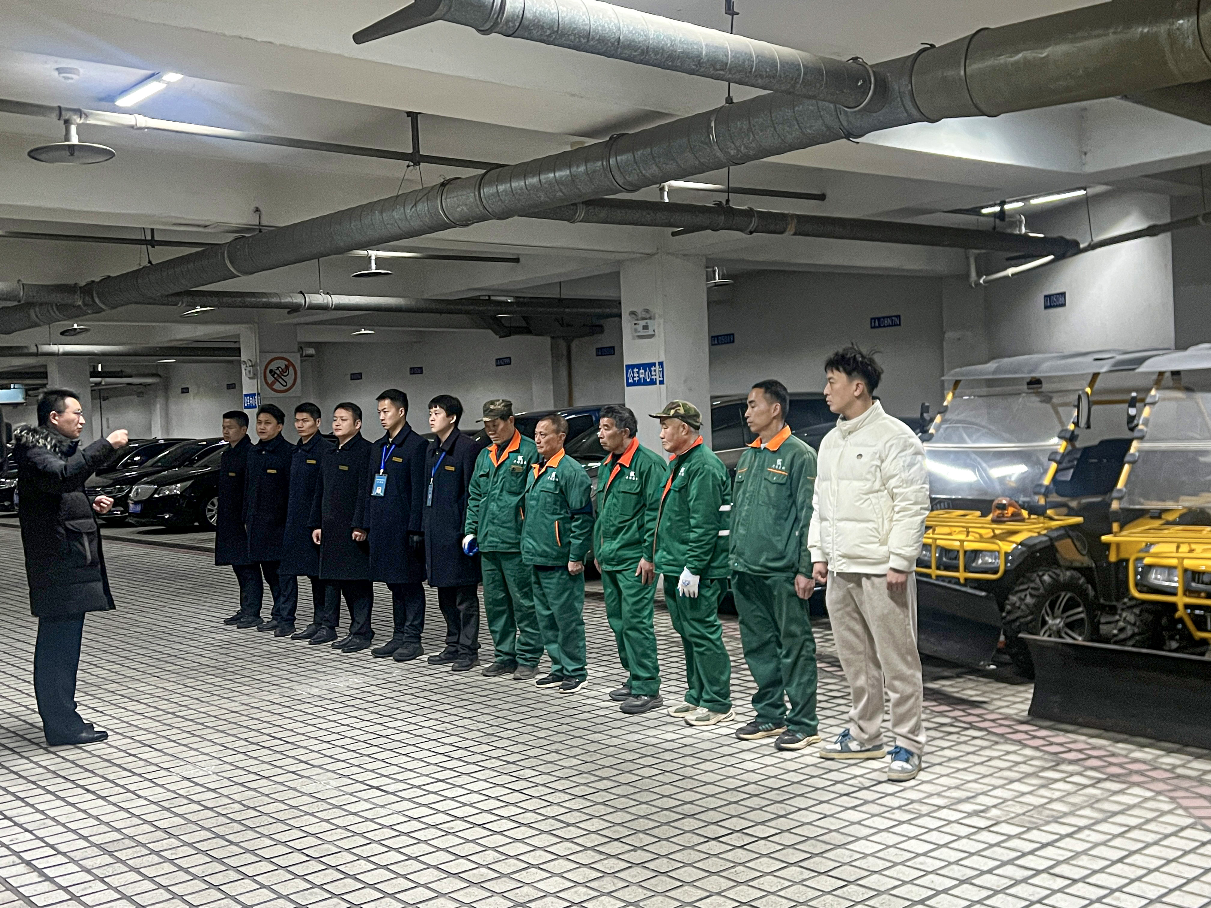 系统检视各区域应急预案及多部门联动机制,提升预案针对性、可操作性。围绕消防、治安、设备故障等常见情景,组织各物管片区开展针对性应急演练17场,有效检验片区响应速度与区域协同处置实效。针对冬季雨雪冰冻等天气,提前完成扫雪除冰物资设备的清点与补充,确保应急物资齐备、人员到位,随时有效应对突发情况。